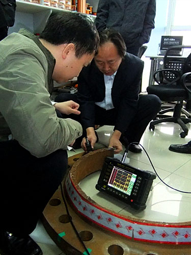| 3.现场演示便携式阵列涡流仪对法兰盘纵向和周向自然裂纹的检测过程。 |