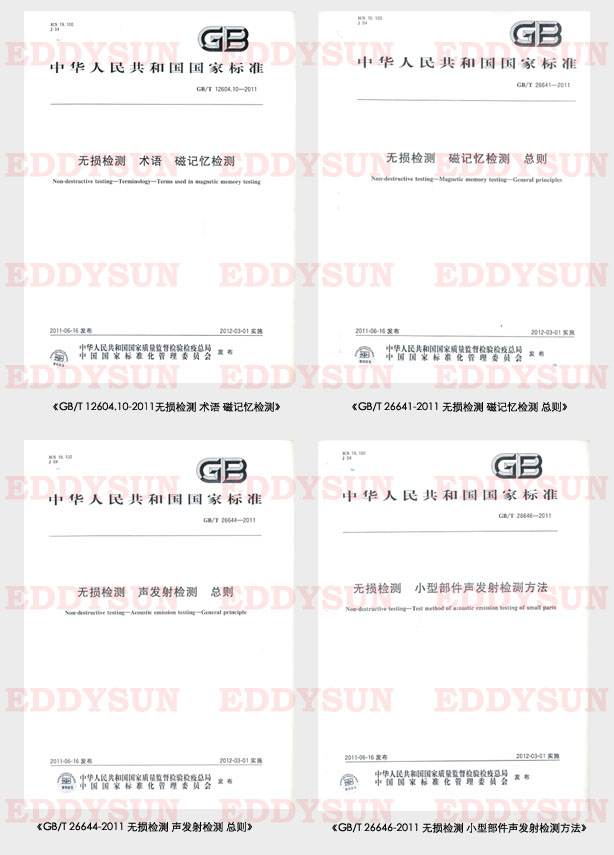由爱德森(厦门)电子有限公司负责或参与制定的《GB/T 12604.10-2011无损检测 术语 磁记忆检测》、《GB/T 26641-2011 无损检测 磁记忆检测 总则》、《GB/T 26644-2011 无损检测 声发射检测 总则》、《GB/T 26646-2011 无损检测 小型部件声发射检测方法》等4项国家标准近日已发布出版,4项标准将在2012年3月起实施。 |